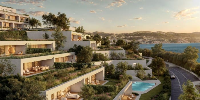 Le complexe résidentiel se présente comme un grand balcon ouvert sur la mer qui abrite des maisons individuelles de 4 et 5 chambres à coucher avec un espace extérieur composé de plusieurs terrasses, d’un jardin avec piscine, d’un garage pour 2 véhicules et, dans certains cas, d’une salle polyvalente et d’un gymnase.