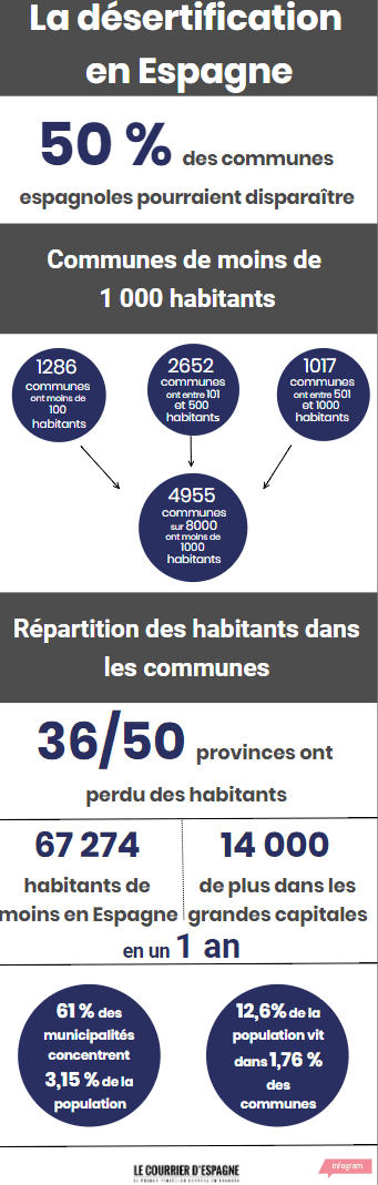 Des cas sont encore plus inquiétants, comme les 1286 villages qui ne dépassent pas les 100 habitants, soit 16 % des communes d’Espagne. En un an, 48 communes sont passées sous cette barre symbolique.  Aujourd’hui 61 % des municipalités concentrent seulement 3,15 % de la population espagnole.