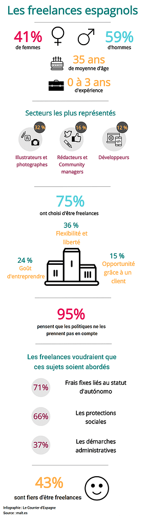 En Espagne, la moyenne d’âge des freelances est de 35 ans. 41 % d’entre eux sont des femmes et 59 % des hommes et ont une expérience moyenne de 0 à 3 ans. Parmi eux, les illustrateurs et photographes sont les plus nombreux (32 %), suivis des rédacteurs de contenus et community managers (16 %) et enfin des développeurs (12%).