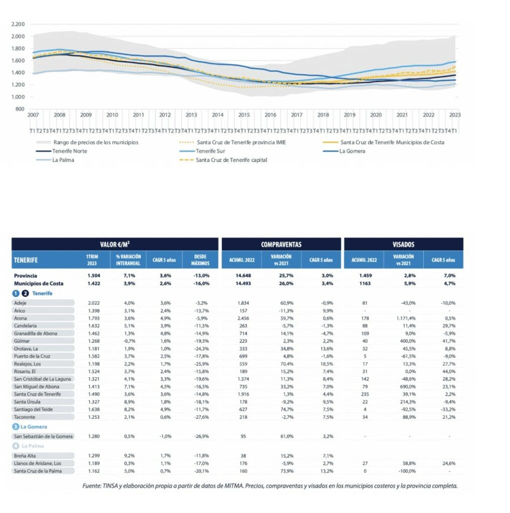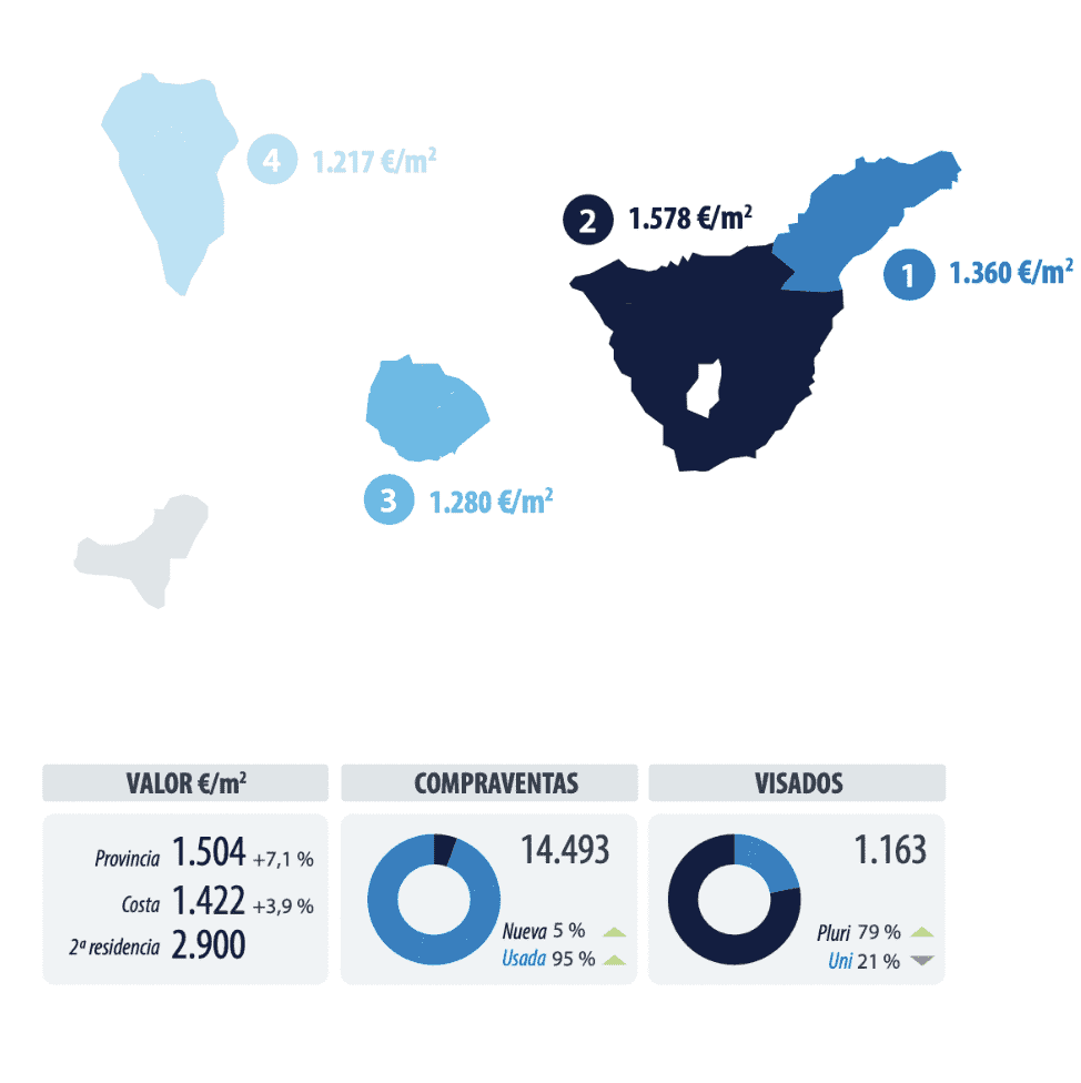 Le prix des maisons de vacances sur la côte reste élevé et nettement supérieur au prix moyen. Il est situé en moyenne dans les 2.250€/m2 à Tenerife nord, à 3.500€/m2 à Tenerife sud, 1400€/m2 à La Gomera et 1.800 €/m2 sur l’île de La Palma. Par rapport à une valeur moyenne générale du logement dans les municipalités côtières de Tenerife de 1422€/m2 et une valeur moyenne de la province complète de 1.504€/m2.