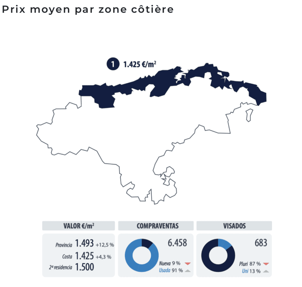 Le prix des maisons de vacances sur la côte se maintient et est conforme à la région. Il s’élève en moyenne à 1.500€/m2, contre une valeur moyenne globale des logements dans les communes côtières de Cantabrie de 1 425 €/m2 et une valeur moyenne pour l’ensemble de la province de 1.493 €/m2.