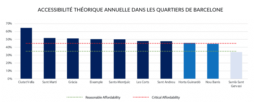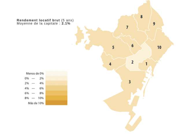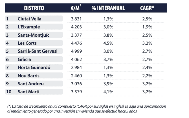 Les prix les plus élevés ont été enregistrés dans les quartiers de Sarrià-San Gervasi, Les Corts et L’Eixample, où les prix ont dépassé les 4 000 euros le mètre carré. À l’opposé, les prix les plus bas ont été enregistrés à Nou Barris, Sant Andreu et Horta-Guinardó, avec moins de 3 000 euros par mètre carré.