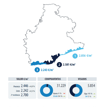 Dans la province de Barcelone, le poids du marché de la première résidence dans la capitale et son agglomération est élevé et les résidences secondaires sur la côte représentent un pourcentage plus faible de la demande globale. Les municipalités côtières représentent 44% et 38% des ventes et des approbations dans la province, mais beaucoup de ces zones ne sont pas exclusivement destinées à la villégiature, mais ont une part significative de premières résidences.