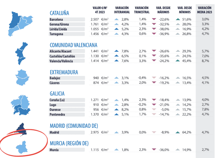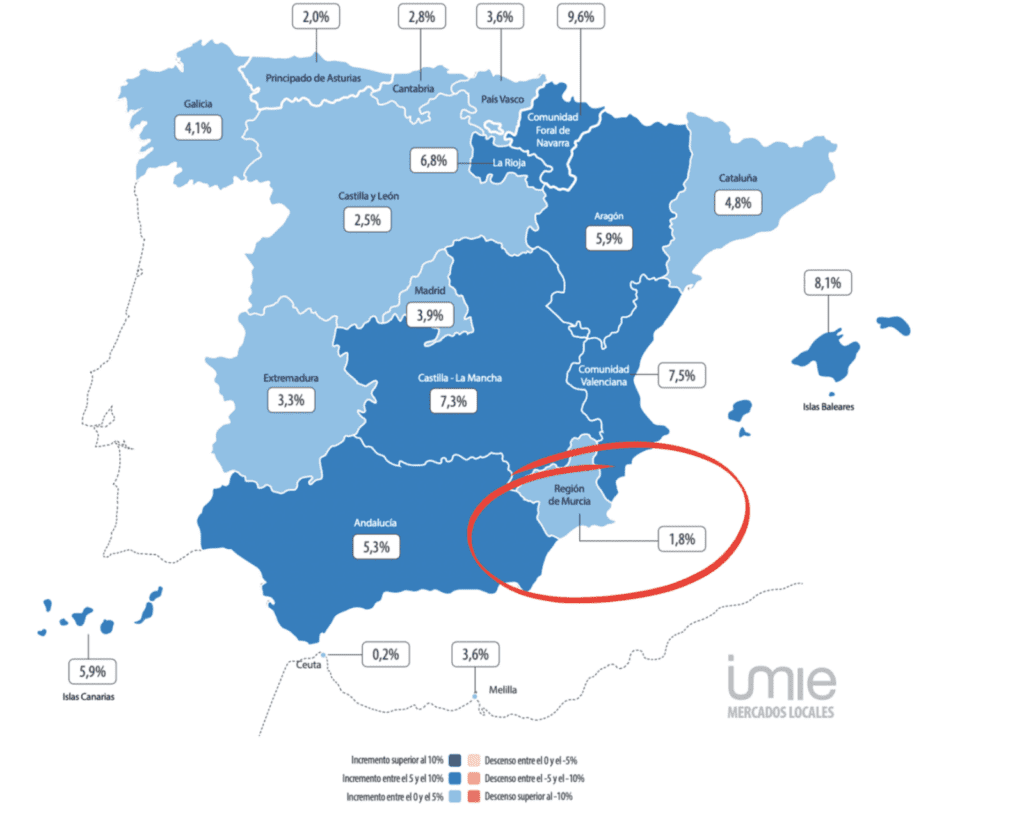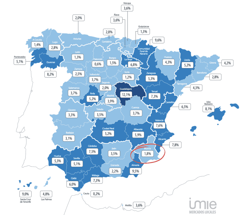 Le prix des maisons de vacances sur la côte n’augmente pas et est supérieur au prix moyen. Il s’élève en moyenne à 1.100 €/m2 à La Manga del Mar Menor et à 1.650€/m2 entre Mazarrón et Águilas, contre une valeur moyenne globale des logements dans les communes côtières de Murcie de 1.033 €/m2 et une valeur moyenne pour l’ensemble de la province de 1.102€/m2.