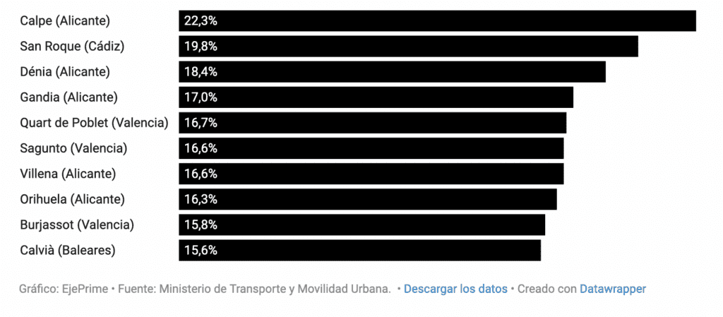 Outre San Roque, pour trouver une commune en dehors de la Communauté valencienne, il faut descendre à la 10ème position, occupée par Calvià, à Majorque, la 4ème commune avec le prix le plus élevé d’Espagne à la fin de l’année, seulement derrière Santa Eulalia del Río (Ibiza), Ibiza et San Sebastián, avec 4.261 € par m2. La municipalité des Baléares a augmenté la valeur de 15,6% en 2023.