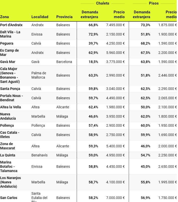 Une autre zone remarquable est Peguera, à Calvià (Majorque), où jusqu’à 68,2 % de la demande étrangère concerne des appartements, qui atteignent un prix moyen de 1,59 million d’euros. Par ailleurs, 39,7 % des personnes intéressées par les villas sont des étrangers, avec un prix moyen de 4,25 millions d’euros.