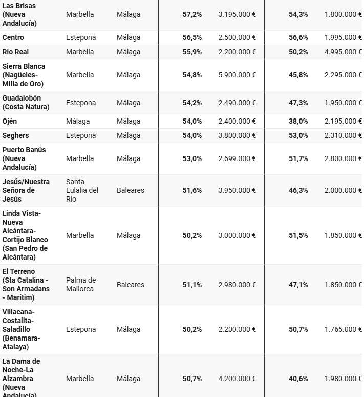 Parmi les 32 zones résidentielles où les prix des logements de luxe répondent aux exigences, les destinations situées dans les îles Baléares se distinguent, avec 14 quartiers ou districts entre Majorque et Ibiza. Sur la Costa del Sol, ce sont les quartiers de Marbella, Estepona et Benahavís qui se distinguent, ainsi que ceux d’Altea (Alicante) et de Gavà (Barcelone).