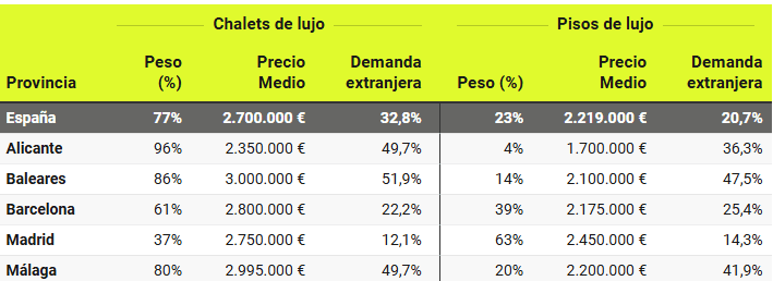 Les îles Baléares, Malaga et Alicante, ainsi que Madrid et Barcelone, disposent du plus grand parc de logements de luxe en Espagne et d’une demande étrangère importante, en particulier dans les destinations touristiques côtières.