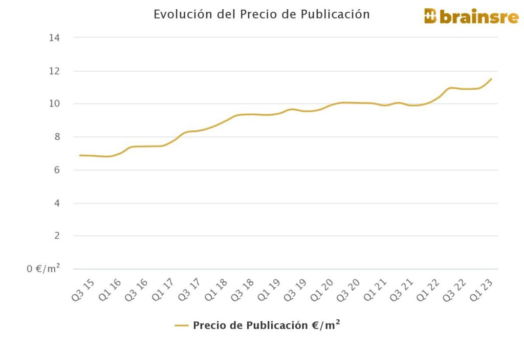 Le prix moyen de location d’un bien immobilier en Espagne s’élève à 11,5€ par m2 et par mois, selon les données de Brainsre, soit une hausse de 11% en glissement annuel et de 5,2% en glissement trimestriel. En termes de loyer moyen, il atteint 1.191€ par mois.