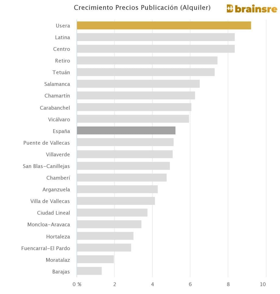 Dans le cas du quartier madrilène d’Usera, les loyers atteignent actuellement un niveau record de 13,3€/m2/mois, un montant qui a augmenté de 10,2% au cours de l’année dernière et de 9,3% au cours du dernier trimestre.