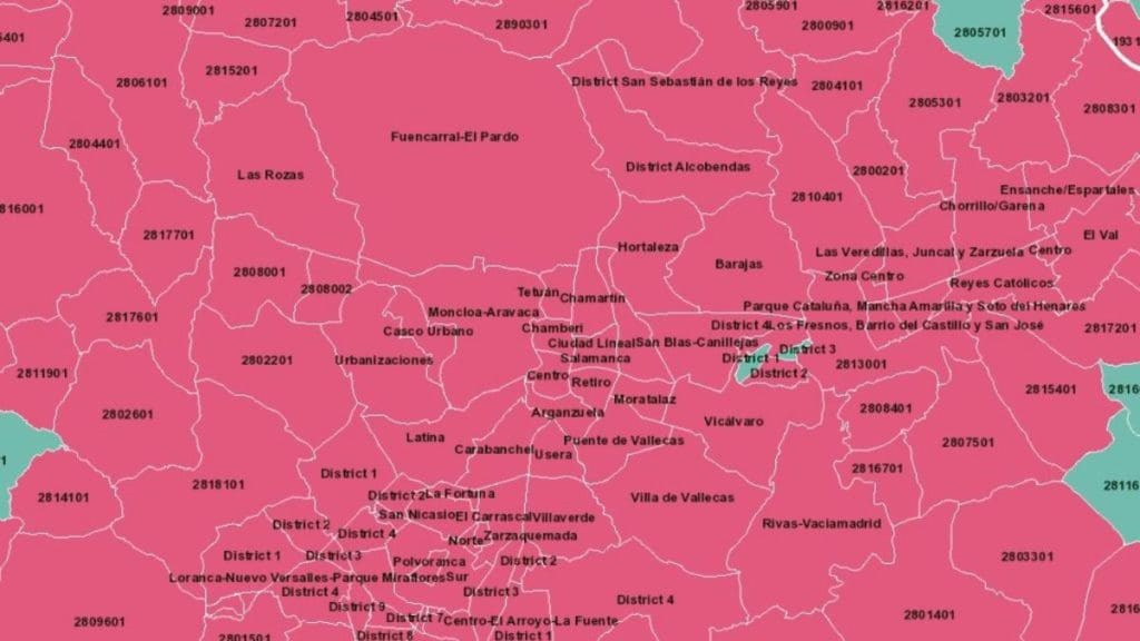 Avec les nouveaux changements qui vont être adoptés, si une seule des deux conditions est remplie, tous les districts qui composent la capitale seront considérés comme des zones tendues, comme on peut le voir sur la carte ci-dessus, où toutes les zones de Madrid sont en rose. Il reste à décider si la désignation de « zone tendue » s’appliquera à l’ensemble de la municipalité ou si elle pourra être modulée en fonction des quartiers ou même des secteurs de recensement.