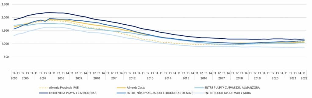 Le prix des résidences secondaires est entre 30 et 60 % plus élevé que celui des résidences principales. Le prix moyen des logements de vacances est de 1 400 €/m2 entre Pulpí et Cuevas del Almanzora, de 1 700 €/m2 à Roquetas de Mar (typologie principalement multifamiliale) et des valeurs atteignant 1 900 €/m2 entre Vera Playa et Carboneras (typologie unifamiliale). La valeur moyenne des logements généraux dans les municipalités côtières d’Almeria est de 1 064 €/m2.