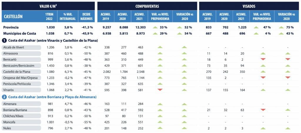 Le prix des résidences secondaires est entre 50 % et 60 % plus élevé que celui des résidences principales. Les maisons de vacances sur la côte de Castellón ont une valeur moyenne comprise entre 1 700 €/m2 et 1 500 €/m2, contre une valeur moyenne pour les logements généraux de 1 038 €/m2 dans les municipalités côtières de Castellón.