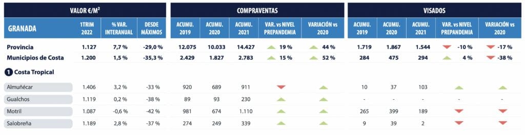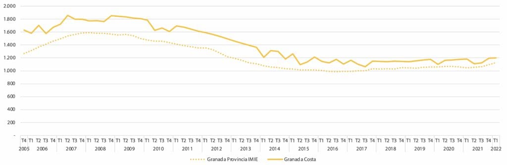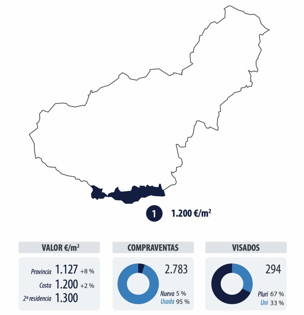 Le prix des résidences secondaires est supérieur de 10 % à celui des résidences principales. Les maisons de vacances les plus courantes se situent en moyenne entre 1 100 €/m2 et 1 500 €/m2, ce qui en fait l’une des provinces présentant la plus faible différence entre les deux segments. La valeur moyenne des logements généraux dans les municipalités côtières de Grenade est de 1 200 €/m2.