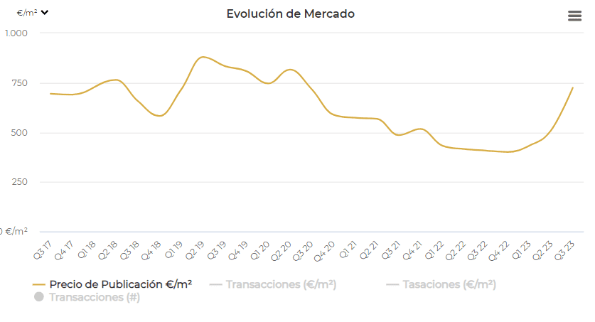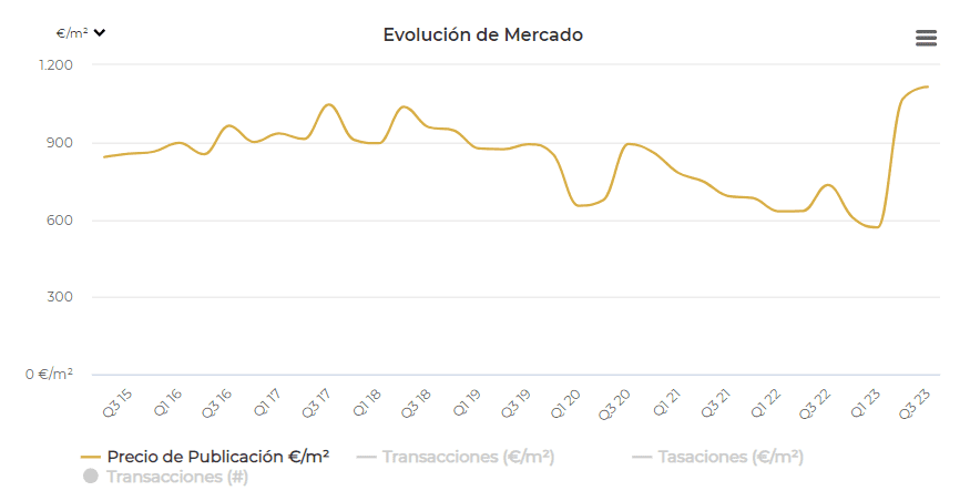 Dans cette partie de la région, les prix ont augmenté de 35,1% au cours du dernier exercice pour atteindre 2 692,4€ par m2, atteignant également des niveaux record. En outre, d’un trimestre à l’autre, ils ont connu une hausse remarquable de 35,2%, selon les données de la plateforme immobilière de big data Brainsre.