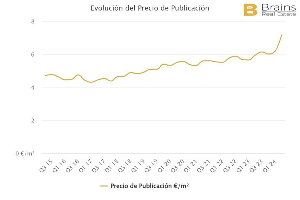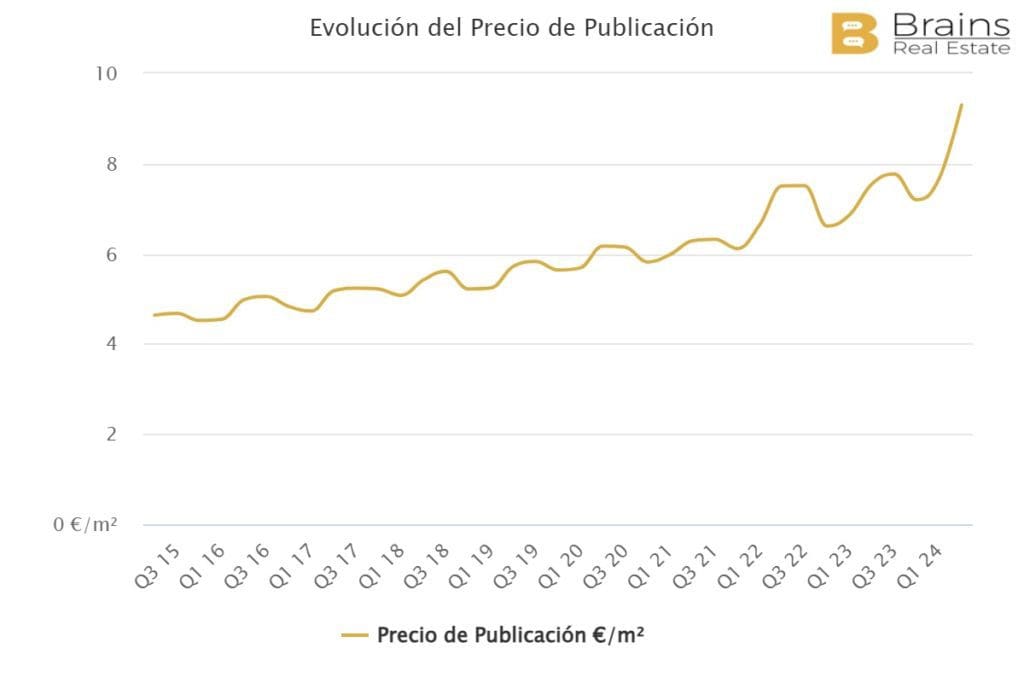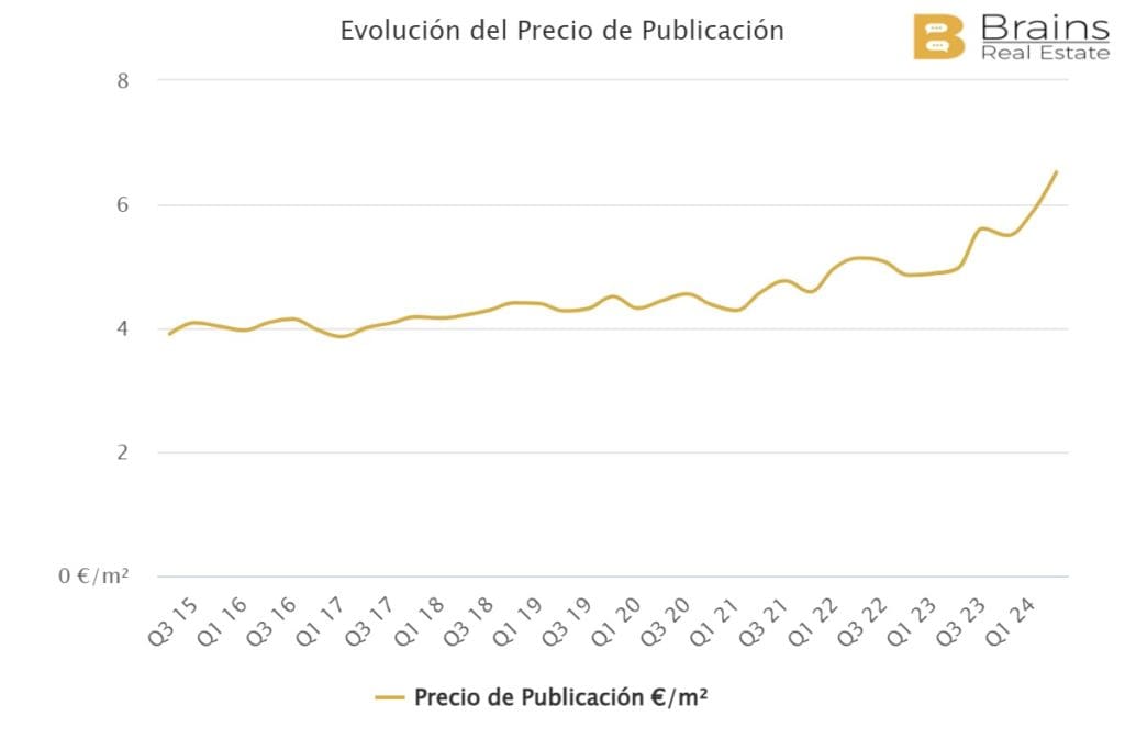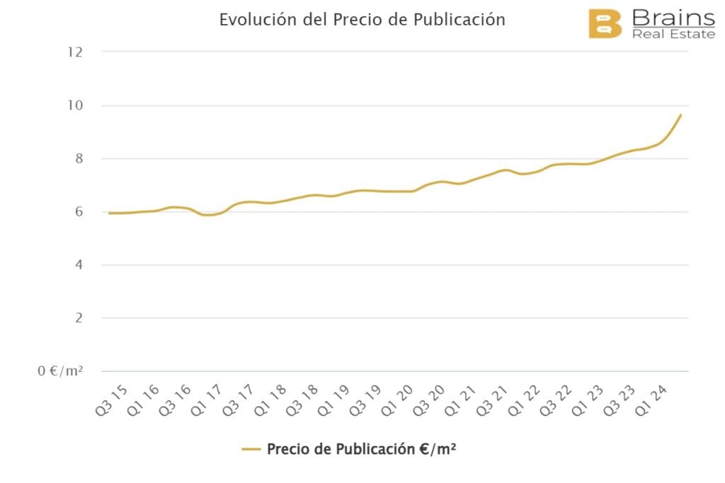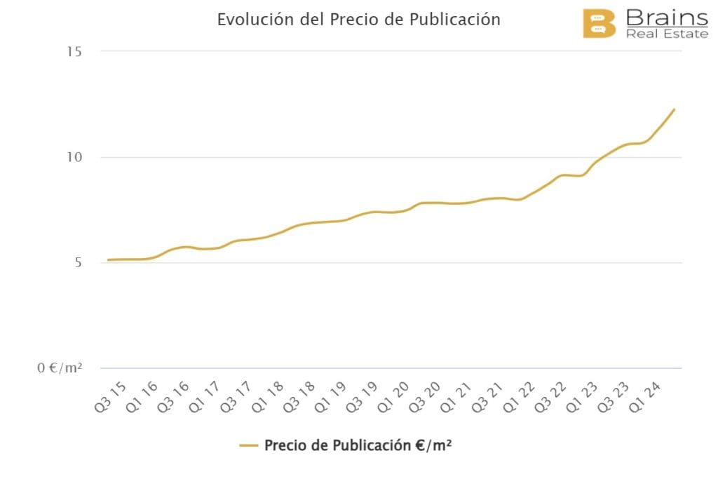 Le prix moyen d’une propriété à louer en Espagne a atteint 13,6€/m2/mois, ce qui représente une augmentation de 15,6% au cours de l’année dernière, tandis que le taux d’un trimestre à l’autre a augmenté de 6%, selon les données de la plate-forme de big data immobilière Brains Real Estate.
