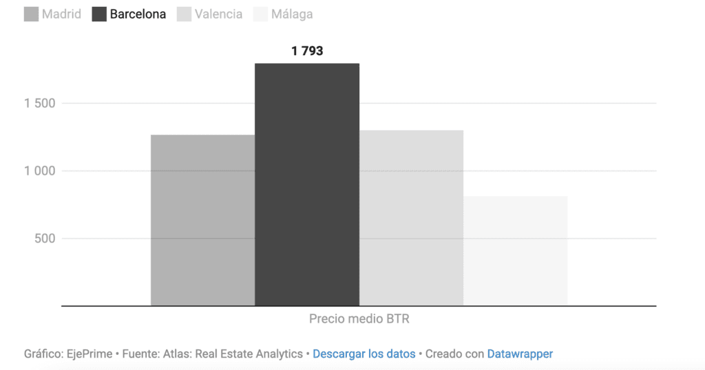 Dans l’évolution des livraisons de 2019 à 2023, Madrid est en 1ere position avec un cumul de plus de 10.000 logements. Avec un prix moyen de 1.266€ par mois, la capitale concentre son offre de built-to-rent à louer dans des quartiers tels que PAU de Vallecas, avec 159 biens ; Valdebebas, avec 135 biens et Valdeacederas, avec 127 biens. La demande de Madrid a connu sa plus forte absorption, 32,36%, dans le district central.