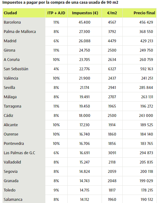 Le calcul des taxes à payer en fonction de la communauté autonome est également important pour éviter les surprises. Par exemple, acheter un logement dans la ville de Barcelone signifie payer 11% d’impôts (ITP + AJD), soit payer 45.400 euros pour une propriété de 90 m2. C’est la ville avec les taxes les plus élevées.