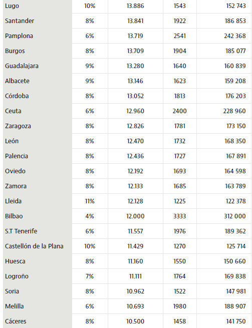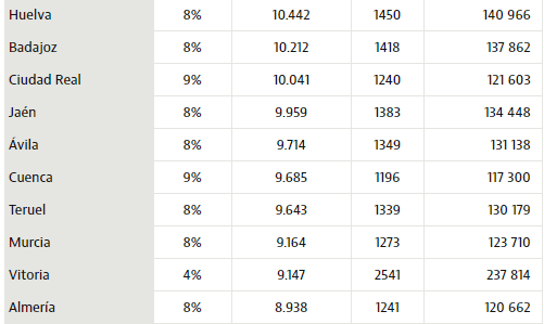 À l’inverse, Almeria est la ville où il est le moins cher d’acheter une maison. Pour acquérir une propriété de 90 m2, vous devez payer 8.938 euros de taxes (8%), ce qui représente un total de 120.662 euros. À Vitoria, l’achat d’une maison coûte également moins cher. Avec un ITP de 4%, le déboursement s’élève à 9.147 euros en moyenne, pour un total de 237.814 euros pour une maison de 228.668 euros en moyenne.