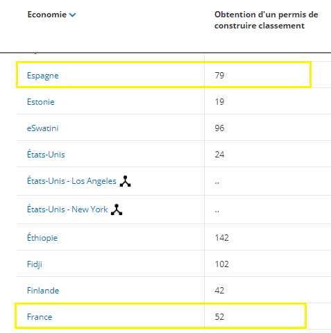 De même l’Espagne est 79ème dans le classement de l’obtention de permis de construire. La France quant à elle est à la 52ème place. Cet indicateur enregistre les procédures, le temps et les coûts nécessaires à la construction d’un entrepôt.Dans ce critère, on compte également l’obtention de licences et permis, la soumission de toutes les notifications requises, les demandes et réception des inspections obligatoires ainsi que l’obtention des raccordements aux services publics.