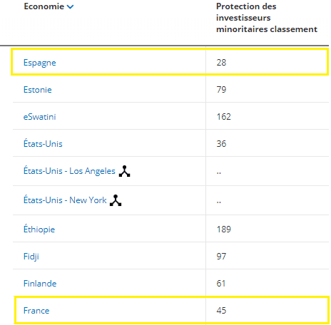 Autre critère de comparaison important entre les deux pays: la protection des investisseurs minoritaires. Cet indicateur mesure le niveau de protection des investisseurs minoritaires contre les abus de biens sociaux des administrateurs, les droits des actionnaires, les garanties en matière de gouvernance et les exigences en matière de transparence des entreprises réduisant ainsi le risque d’abus. Et sur ce point, l’Espagne (28ème) est devant la France (45ème).