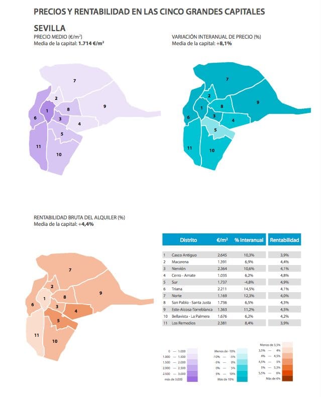 Les quartiers les plus chers, situés à Madrid et à Barcelone et avec des chiffres supérieurs à 4 000 € / m2, sont ceux de Salamanque, Chamberí, Retiro, Centro et Chamartín (Madrid), et Sarrià-Sant Gervasi, Eixample et Les Corts (Barcelone).