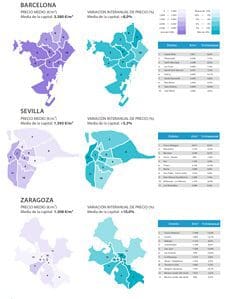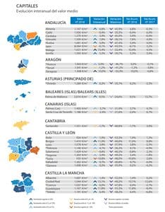Au cours du quatrième trimestre, sept villes connaissent une baisse supérieure à 50%( Lleida, Logroño, Guadalajara, Castellón, Ávila, Saragosse et Albacete). Les capitales de province les plus chères sont San Sebastián (3 383 € / m2 en moyenne), Barcelone (3 380 € / m2), Madrid (2 965 € / m2) et Bilbao (2 219 € / m2).