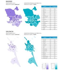 À Madrid, le taux de croissance élevé est plus répandu, soulignant Villaverde et Ciudad Lineal, tous deux supérieurs à 20%, suivis par Arganzuela, Chamberí, Carabanchel, Puente de Vallecas, Vicálvaro et San Blas, qui dépassent les 15% d’augmentation du prix moyen depuis le quatrième trimestre de 2017. En ce qui concerne Valence, la hausse des prix à Rascanya (de valeurs très serrées à la baisse en raison de la crise) dépasse le reste des zones de la ville, suivi par L’Olivereta, Camins al Grau et Poblados del Norte, toutes proches d’une variation à la hausse de 20%.