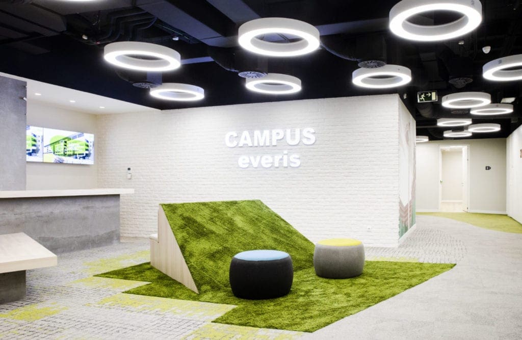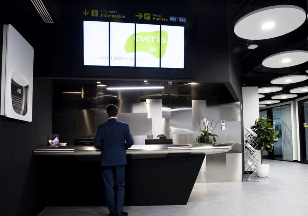 Everis a implémenté ce système à son siège social de Madrid, situé sur l’Avenida Fuente de la Mora. Ce bâtiment de 35 000 m² compte 3 250 postes de travail, 350 salles de réunion et 22 espaces à usage commun tels que cafétérias, salles à manger, espaces collaboratifs ou espaces multifonctionnels.
