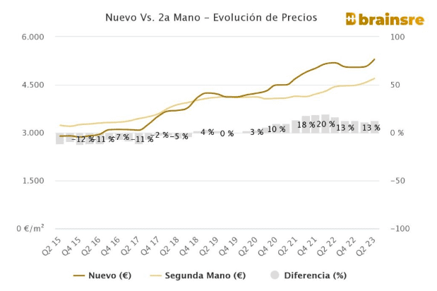 Si l’on analyse séparément le prix des logements neufs et d’occasion dans la capitale espagnole, on constate que les prix des deux marchés ne cessent d’augmenter depuis la fin de l’année 2019. Actuellement, la différence entre les deux prix est de 13%, ce qui est faible par rapport à la moyenne espagnole, qui va jusqu’à 40%.