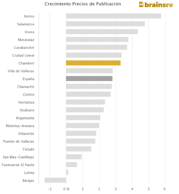 Tous les quartiers qui composent la ville de Madrid ont enregistré une augmentation des prix des logements au cours du dernier trimestre, à l’exception de Barajas, dont le prix a baissé de 1,3%.