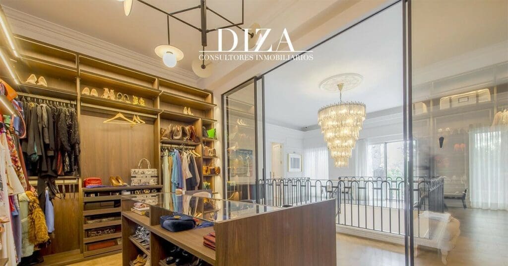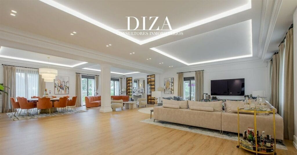 L’entrée principale de la propriété mène à un jardin de palmiers avant l’entrée de la maison, qui a une surface construite de 730 m2. Au rez-de-chaussée se trouve un grand hall d’entrée de 120 m2, également divisé en plusieurs zones. L’espace, entièrement ouvert, comprend un impressionnant salon formel, un espace TV et une salle à manger, ainsi qu’un accès au salon avec baie vitrée, qui donne sur le jardin et la roseraie.