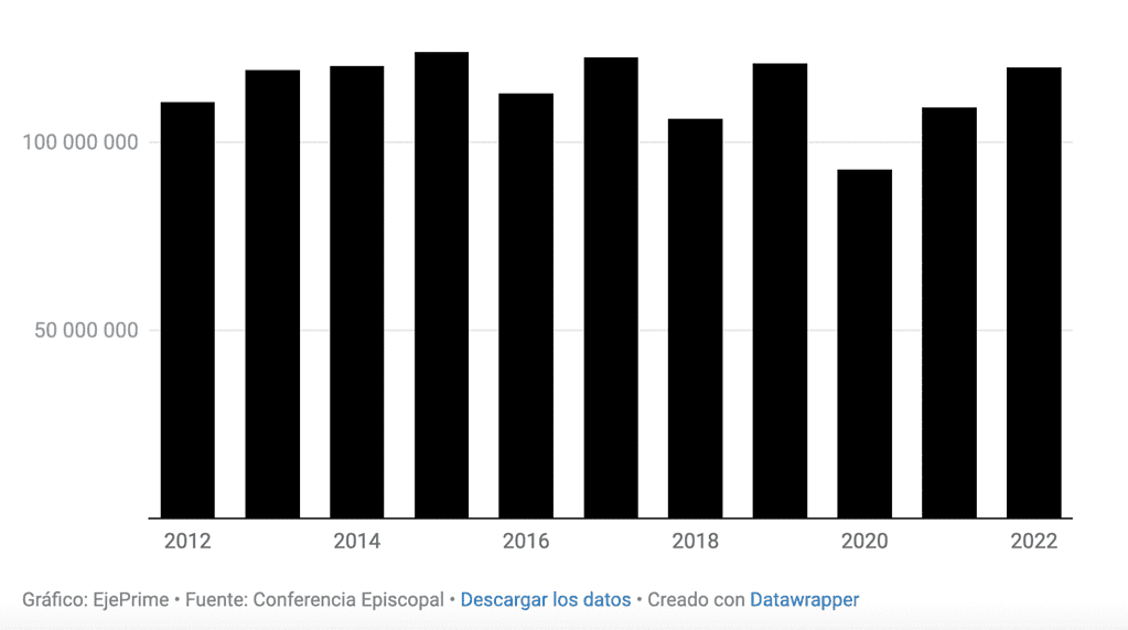 Les revenus de l’Église en Espagne n’ont jamais été aussi élevés depuis avant la pandémie, lorsque le chiffre d’affaires du patrimoine atteignait 120,9 millions d’euros, soit 11% des comptes. Au cours de la dernière décennie, le poids de cette rubrique s’est maintenu autour de 10%, le chiffre le plus élevé de la dernière décennie ayant été enregistré en 2017, où les revenus tirés des biens ecclésiastiques ont représenté 13% des revenus.