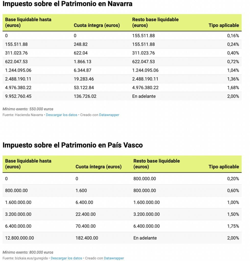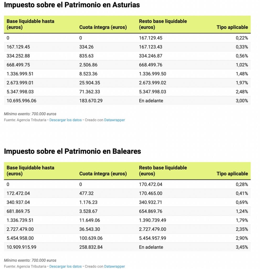Les autres communautés qui font la différence sont les îles Baléares et la Navarre, car elles sont les seules à établir des tranches d’imposition différentes de celles du reste des communautés. Dans le cas des îles, ils sont plus élevés que dans le reste de l’État, tandis que dans le cas de la Navarre, il y a moins de sections et pour des montants inférieurs.