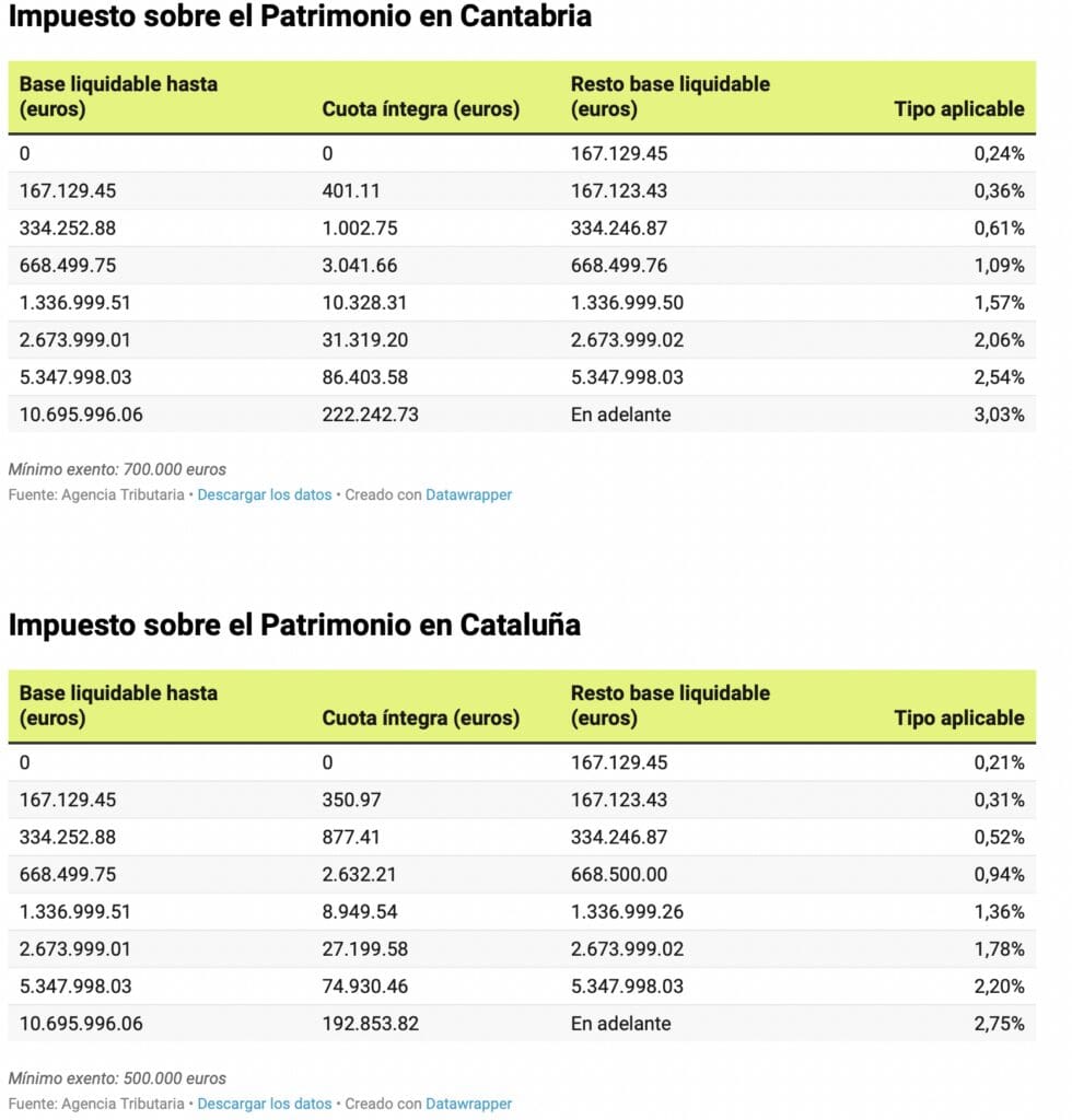 Celui de la Catalogne est un cas unique, car il établit une exonération minimale de 500 000 euros et, comme les trois Communautés autonomes précédentes, il applique également des taux supérieurs à ceux du barème de l’État dans toutes les sections. Mais dans ce cas, le taux appliqué pour les assiettes à partir de 10,6 millions d’euros est ramené à seulement 2,75 %. Seuls la Galice, la Navarre et le Pays basque appliquent des taux inférieurs aux fortunes dont l’assiette fiscale est plus élevée.