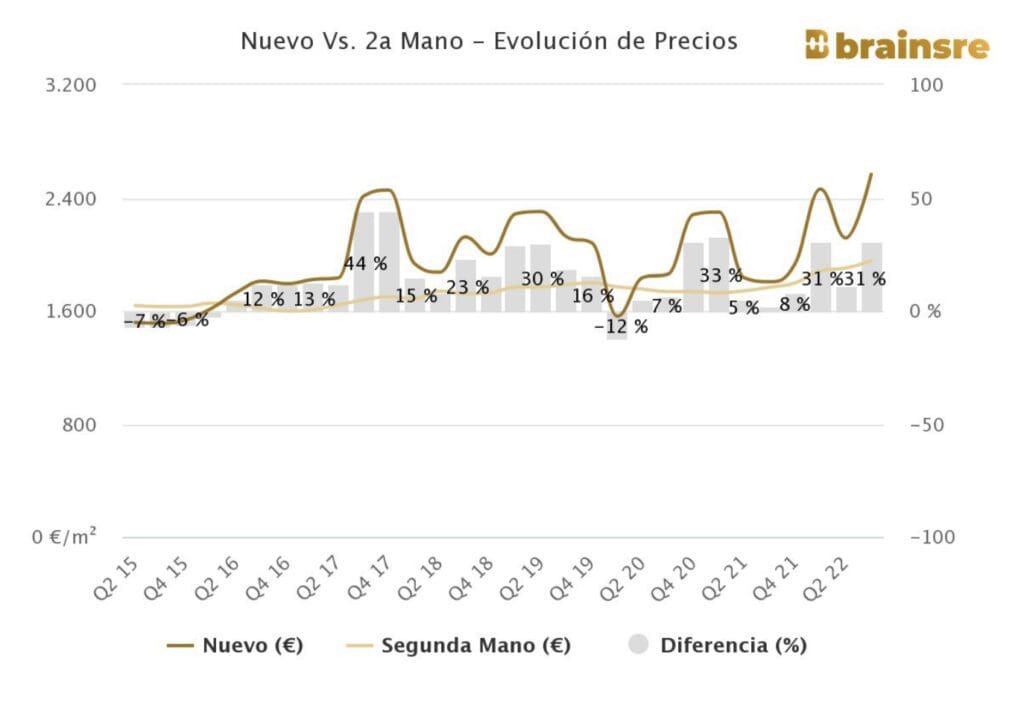 Alors que le prix moyen des logements anciens s’élève à 1 953 €/m2 ; 10,54% de plus qu’à la même période de l’année précédente, selon les données compilées par la plateforme de mégadonnées immobilières Brains RE.
