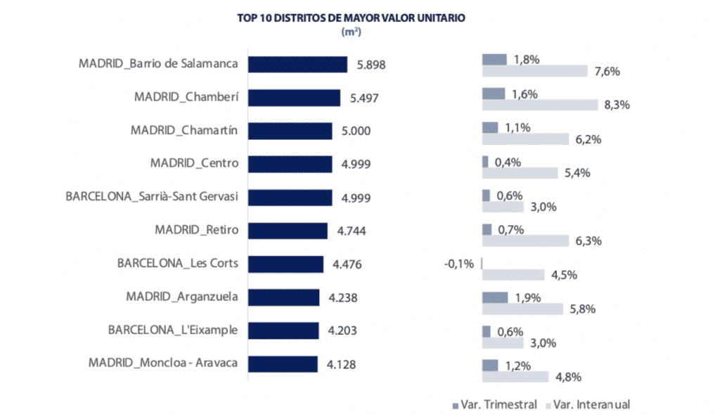 Globalement, les quartiers les plus chers sont situés à Madrid. Parmi les 10 premiers, on trouve 7 quartiers à Madrid et 3 à Barcelone, avec des valeurs supérieures à 4.100€/m2. Le Barrio de Salamanca à Madrid occupe la première place, avec une valeur supérieure à 5.800€/m2. Chamberí, également à Madrid, arrive en deuxième position.
