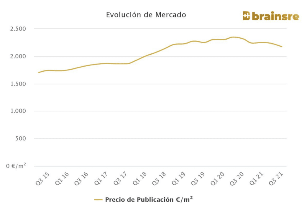 Le prix des logements dans ce quartier de Madrid, où près de 92% de l’offre sont des appartements, principalement avec deux ou trois chambres, a également baissé de 6,2% l’année dernière, à 2.172 euros le m2. Aussi, en comparaison trimestrielle, les prix ont baissé de 2,5%.