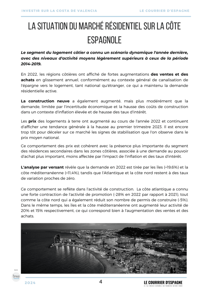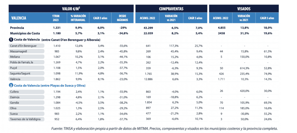 Le marché des communes côtières de Valence représente la moitié du marché de l’ensemble de la province et 51% des ventes et des approbations. En 2022, il a été légèrement plus dynamique en termes de ventes et d’achats et nettement plus actif en termes de visas que l’ensemble de la province.
