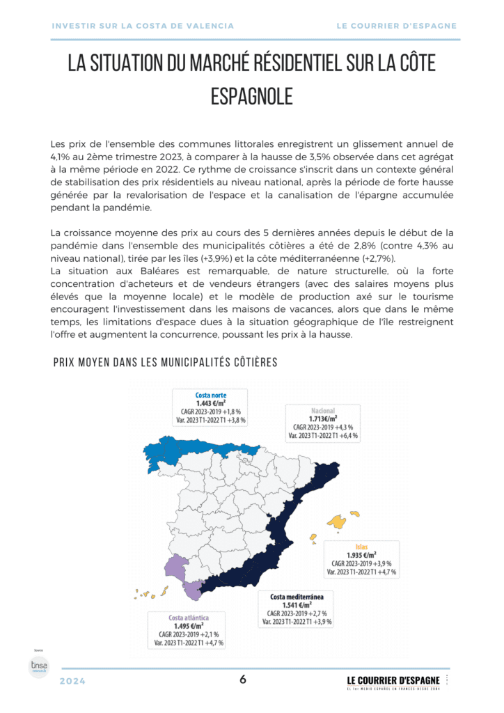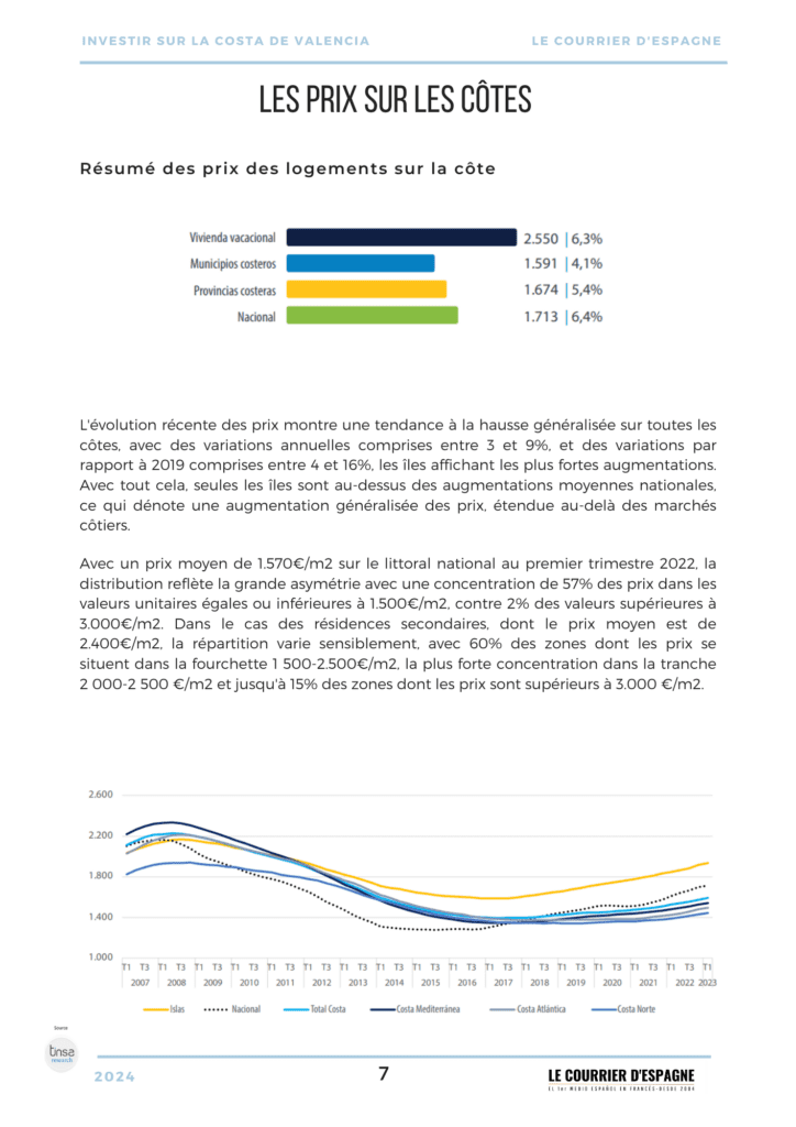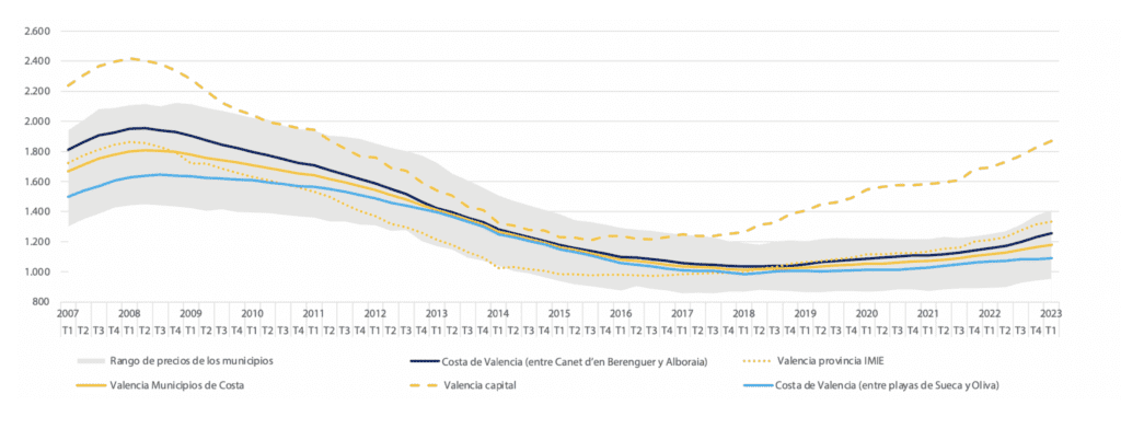 Le prix des logements de vacances sur le littoral augmente et est nettement plus élevé que le prix moyen. Il s’élève en moyenne à 1.750€/m2 entre Canet d’en Berenguer et Alboraia et à 1.900€/m2 entre les plages de Sueca et Oliva, contre une valeur moyenne globale des logements dans les communes côtières de Valence de 1.180€/m2 et une valeur moyenne pour l’ensemble de la province de 1.331€/m2.