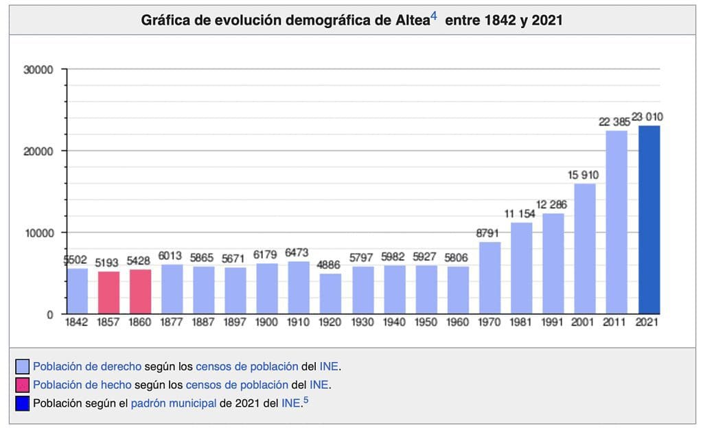 Altea était une ville dédiée à l’agriculture et à la pêche, avec une population stable d’environ 5.000 habitants. Cette situation a radicalement changé dans les années 60 du XXe siècle, avec l’essor du tourisme méditerranéen. Dès lors, le tourisme est devenu le principal moteur économique de la ville et sa population a augmenté de façon exponentielle, triplant à la fin du siècle. Au cours de la première décennie du XXIe siècle, cette croissance a été accélérée par un autre boom, celui du développement urbain. La ville s’est étendue, tant dans son noyau urbain que dans les nombreuses urbanisations qui l’entourent.