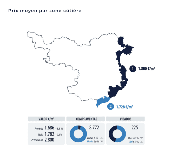 Si l’on élargit l’horizon temporel, le prix moyen sur la côte au cours des 5 dernières années montre une croissance moyenne modérée d’environ 3%, plus intense dans les îles (+3,9%), où la concurrence pour l’espace est plus grande, et plus douce sur la côte nord (+1,8%), où la combinaison d’une faible activité des promoteurs reflète un stock suffisant pour répondre à l’augmentation de la demande, qui a été d’une intensité similaire de part et d’autre.