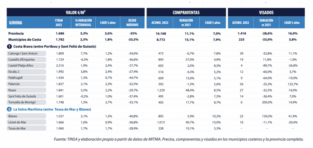 Le prix des maisons de vacances sur la côte augmente et est nettement plus élevé que le prix moyen. Il s’élève en moyenne à 2.300€/m2 sur la Costa Brava et à 3.000€/m2 dans la Selva Marítima, contre une valeur moyenne globale des logements dans les communes côtières de Gérone de 1.782€/m2 et une valeur moyenne pour l’ensemble de la province de 1.686 €/m2.