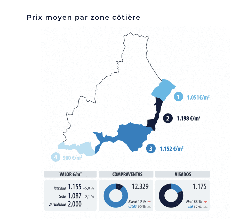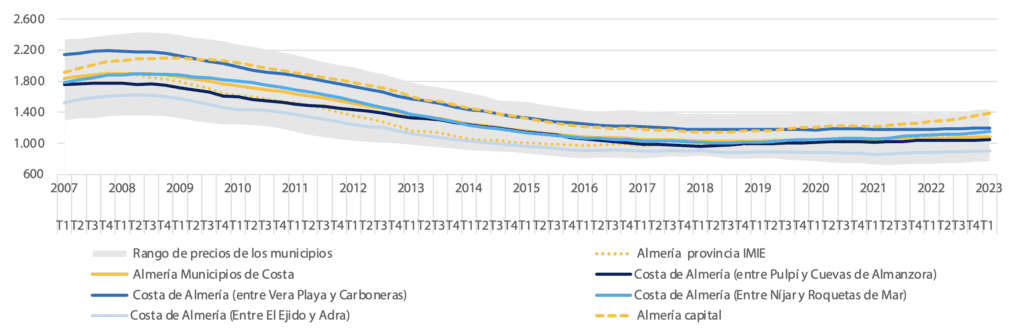 Le prix des maisons de vacances sur la côte augmente et est nettement supérieur au prix moyen. Il se situe en moyenne à 2.000€/m2 entre Pulpí et Cuevas del Almanzora, à 1.850€/m2 entre Vera playa et Carboneras, à 2.200€/m2 entre Níjar et Aguadulce et à 1 600€/m2 entre Roquetas de Mar et Adra, alors que la valeur moyenne générale des logements dans les communes côtières d’Almería est de 1.087€/m2 et la valeur moyenne pour l’ensemble de la province de 1.155€/m2.