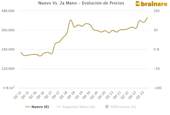 Actuellement, le prix des logements neufs à Mijas, commune à laquelle appartient La Cala de Mijas, est de 3.129€ par m2, soit 32,8% de plus qu’il y a 12 mois et 10,1% de plus qu’il y a 3 mois, selon les données de la plateforme de big data immobilière Brains Real Estate.