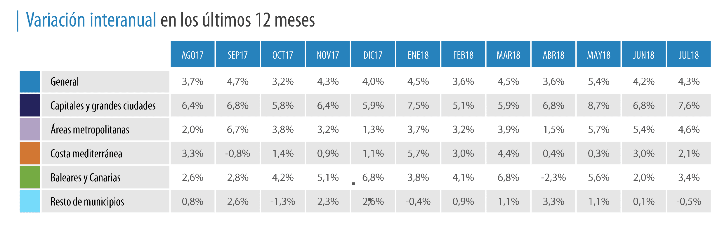 L’indice général des prix des logements finis affiche une augmentation de 4,3% en juillet, contre une augmentation de 6,4% enregistrée le mois précédent. L’impulsion la plus forte est fournie par les « capitales et les grandes villes », qui constituent le marché le plus dynamique, avec une augmentation de 7,6% au cours des douze derniers mois.