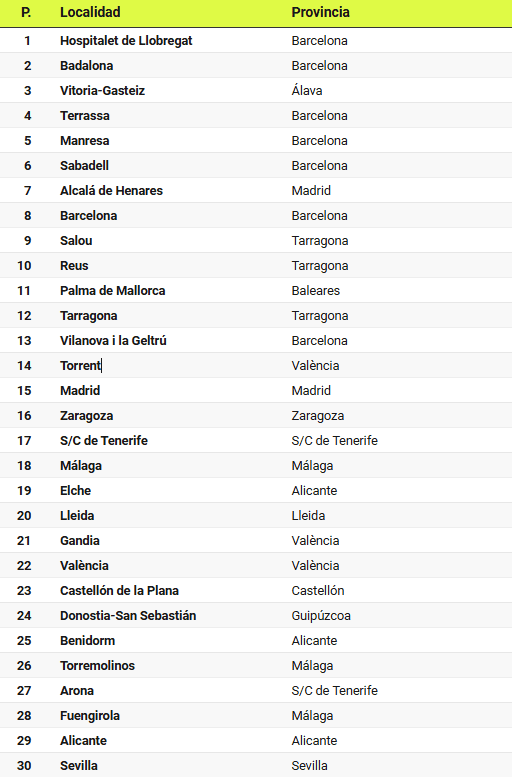 Vitoria (3) et Barcelone (8) sont les seules capitales provinciales à figurer parmi les 10 villes les plus recherchées pour trouver un logement locatif, bien qu’elles occupent pratiquement la suite de la liste des villes où la pression de la demande sur l’offre existante de logements locatifs est la plus forte, comme Palma (11), Tarragone (12), Madrid (15), Saragosse (16), Santa Cruz de Tenerife (17), Malaga (18) et Lleida (20). Par ailleurs, la demande de logements à Vilanova i la Geltru (13), à Barcelone, et à Torrent (14), à Valence, se consolide, devant la capitale valencienne (22).