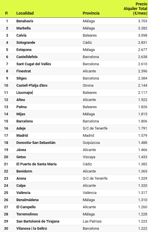 Dans le classement général des villes les plus recherchées pour la location, les prix les plus élevés se trouvent dans les principales zones d’habitation de luxe, qui bénéficient également d’un marché locatif stable. Benahavís (3.700€/mois) reste de loin la plus chère devant Marbella (3.280€), Calvià (3.100€) ou Sotogrande (2.830€).