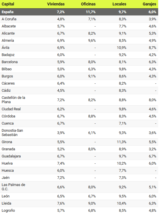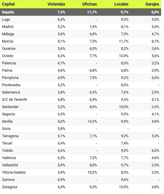 Les locaux sont le produit le plus rentable dans presque toutes les capitales. Les locaux de Murcie et de Gérone sont les plus rentables des capitales, avec respectivement 11,7% et 11,3%. Viennent ensuite Oviedo, Ávila et Saragosse (10,9% dans les 3 cas), Lleida (10,4%), Huelva (10,4%) et Santander (10%). À Barcelone et à Madrid, la rentabilité est de 8,1%.
