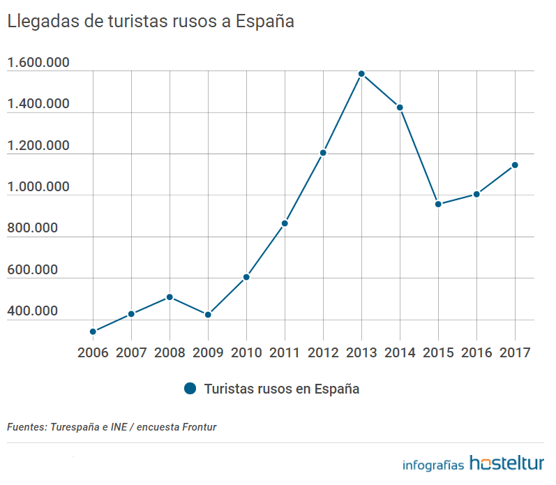 La Russie est le marché touristique en Espagne qui a le plus augmenté en 2017 et tout indique que cette tendance se maintiendra cette année, consolidant le pays comme la destination européenne préférée des Russes. Les perspectives pour 2018 sont « imbattables », comme le rapporte Turespaña depuis le salon touristique du MITT à Moscou, qui a ouvert ses portes cette semaine.